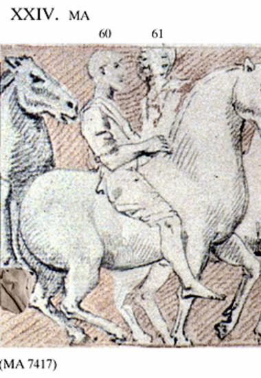 Fragments have been attributed to this block and it has been restored primarily on the basis of Carrey’s drawings. He is the only one to have drawn the two first horsemen (60 and 61) of the tenth group. Here the groups of horsemen end.