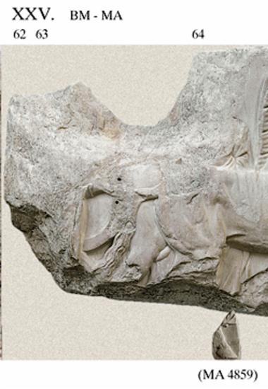 With this block the chariot course of the south side begins. The groups of apobates and chariots are shown in action, with the exception of the first two on blocks XXV and XXVI and the last two on blocks XXXIII and XXXIV. The first show the preparations for the contest, the last have finished. As a rule, each block has a single chariot. Preserved in fragments from block XXV are: a small piece of the clothing and the rim of the apobates' (62) shield, parts of the horse team of the first chariot and part of the marshal’s himation (64). (EN)