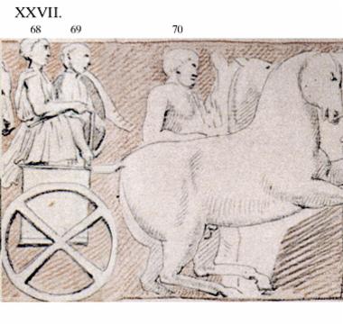 Here we rely on the drawings of Carrey to fill in the missing scenes. Two chariots are shown (the third and fourth, one on each block), one behind the other, already moving with their charioteers (68 and 71) and hoplites (69 and 72) on the chariot and the marshals (70 and 73) standing on the invisible side of the horses. The first (70) is turned toward the right and the second (73) toward the left with right hand outstretched toward the biga.