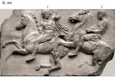 The block was removed by Elgin and is today in the British Museum. The theme represented is that of two young horsemen galloping their horses, one behind the other, toward the left. The second horse overlaps the first only slightly. The first rider (2) at the left is the only nude horseman and he has long hair that blows out behind him with the speed of the horse. Fastened at his neck with a brooch is his chlamys, which blows out behind him in a beautiful sequence of folds. With his right hand he holds the reins and he turns back so that his body is almost frontal and his head turned even more toward the figure behind him (3). His left arm is raised in a gesture not entirely clear, perhaps to adjust the stephane on his head, perhaps to give a signal to the next horseman. The youth (<a href='event:bLs3|46'>133</a>) on block <a href='event:bLs3|46'>N XLVII</a> makes a similar gesture. Horseman (3) wears a modelled cuirass over a short chiton, just as do figures (7) and (18), and he is shod in boots. (EN)