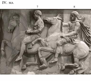 Shown here are a pair of horsemen galloping their horses toward the left. One is bearded (8) and clad similarly to horseman (15) on block VIII in exomis, chlamys, and a fox-skin cap on his head. The younger man (7) wears an anatomical cuirasss over a short chiton, like the rider (3) on block II.