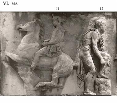 In an effort to break the monotony of lines of galloping horses, this block virtually repeats the theme of block XV. Thus a chlamys-clad youth (12), turned to face the on-coming procession, stoops to fasten the sandal on his left foot, which he rests on a large stone. The only real difference is that this figure wears a helmet. Behind him to the left, his horse in a gallop, is a horseman (11) wearing a cuirass (thorax) tied with thongs through loops attached to lion- shaped fasteners on the the epaulet and chest. He too wears a helmet which, in addition to the central crest will have had a plume attached at the side, as is evidenced by an attachment hole.