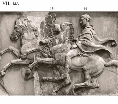 Two horsemen mounted, their horses side by side with the left-hand horse (13) on a lower relief-level and slightly ahead, half concealed by the figure to the right (14). Over the short chiton worn by each, the first rider wears a chlamys, the second is wrapped in an animal skin that billows out behind him. They have the same restrained stance and they look in the same direction, toward the goal. Striking is the difference in the horses’ manes with irregular tufts on the left-hand horse and a well-combed mane on the horse to the right. (EN)