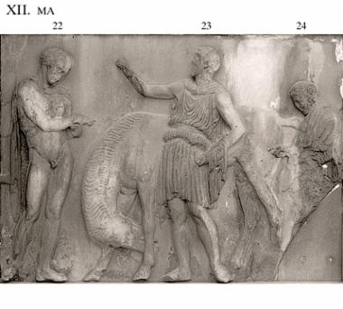 This is a composition of matchless artistry, comprising three human figures and a single horse. In the middle of the block, beside the horse with full and wavy mane, bending its head down between its forelegs to scratch its muzzle, stands a man (23) in almost frontal pose. His weight is on the right leg, with his left free to the side in relaxed stance. He wears a short chiton with overfold double belted and chlamys which hangs down his back and is wrapped around his left forearm. His right arm is raised as if he were giving an order of some sort. In his left he holds a rod (riding-crop), the applied ends of which will have been fastened in the holes in his forearm and thigh. The figure has been interpreted by various scholars as a marshal, a herald, or as Hermes and considered to be the archetypal depiction of the god. To the right stands a little servant (24) carrying his master’s himation over his left shoulder and holding an object of some sort, perhaps a strigil, in his right hand. At the left, another youth (22), with beautifully sculptured anatomy, wearing a chlamys, is represented frontally, his weight on the left leg and the right leg free to the side. He bends his head slightly to his left, examining an object (perhaps a strigil) that he holds with his right hand outstretched above his left.