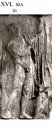 A nude youth (30) is shown standing frontally, in a relaxed pose, slightly turning. His weight is on his left leg, his right free and to the side. He appears to be using his right hand to throw on his chlamys, which hangs over his left shoulder and outstretched arm in rich vertical folds falling to a wavy border. The pose of the figure resembles that of the corner figures on other sides of the frieze, figure(<a href='event:bLs1|46'>149</a>) on block <a href='event:bLs1|46'>S XLVII</a>, figure (<a href='event:bLs2|0'>1</a>) on block <a href='event:bLs2|0'>E I</a>, (<a href='event:bLs3|0'>1</a>) on block <a href='event:bLs3|0'>N I</a>and (1) on block W 1. In antithesis to figure (1) at the left end of the west frieze, the quality of workmanship and the artistry of figure (30) bear witness to a sculptor of outstanding talent among the creators of the west frieze.