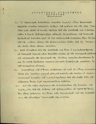Σημείωμα σχετικά με τη σύσταση και το έργο του Οργανισμού Ανελκύσεως Ναυαγίων και συνοπτικός πίνακας των ανελκυσθέντων ναυαγίων από τον Οργανισμό.