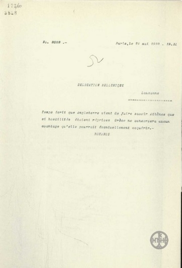 Τηλεγράφημα του Α.Ρωμάνου προς την Ελληνική Αποστολή στη Λωζάννη σχετικά με δημοσίευμα της εφημερίδας Temps για το ενδεχόμενο ελληνικής επίθεσης στην Τουρκία. (EL)