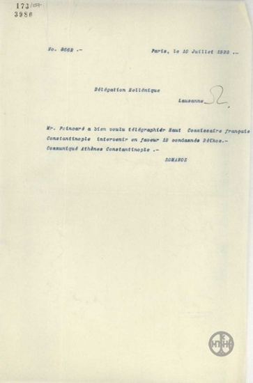 Τηλεγράφημα του Α.Ρωμάνου προς την Ελληνική Αποστολή στη Λωζάννη σχετικά με τη μεσολάβηση του Poincare για τους καταδικασμένους ομογενείς.