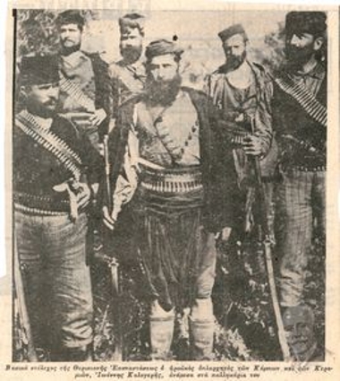 "Βασικό στέλεχος της Θερισιανής Επανάστασης ο ηρωικός οπλαρχηγός των Κάμπων και των Κεραμειών, Ιωάννης Καλογερής, ανάμεσα στα παληκάρια του".