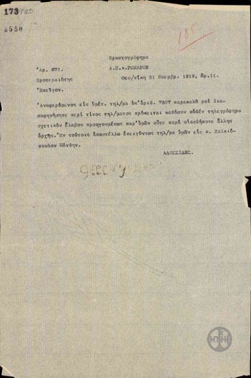 Telegram from K. Adosidis to A. Romanos regarding the clarification of a previous telegram.