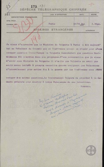 Τηλεγράφημα περί σύσκεψης για την ιταλο-τουρκική διένεξη. (EL)