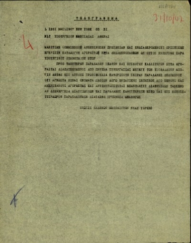 Τηλεγράφημα της Ένωσης Ελλήνων Εφοπλιστών Νέας Υόρκης προς το Υπουργείο Ναυτλίας της Ελλάδας σχετικά με τη διανομή από τη Maritime Commission και την παραλαβή των επτά σκαφών από τους επτά πρώτους αγοραστές.