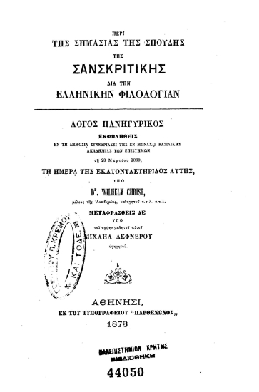 Περί της σημασίας της σπουδής της σανσκριτικής δια την ελληνικήν φιλολογίαν / Λόγος πανηγυρικός εκφωνηθείς εν τη δημοσία συνεδριάσει της εν Μονάχω Βασιλικής Ακαδημία των επιστημών τη 28 Μαρτίου 1860 ... υπό Dr. Wilhelm Christ ... μεταφρασθείς δε υπό του πρώην μαθητού αυτού Μιχαήλ Δεφνέρου υφηγητού.