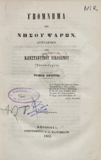 Απάντησις εις τα περί Ψαριανών εσφαλμένως γραφέντα εν τω Ε' τόμω της Ιστορίας του Κ. Παπαρρηγοπούλου / Υπό Κ. Νικοδήμου (Υποναυάρχου).