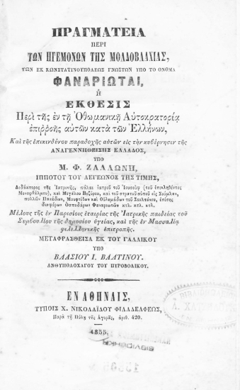 Πραγματεία περί των ηγεμόνων της Μολδοβλαχίας, των εν Κωνσταντινουπόλεως γνωστών υπό το όνομα Φναριώται : ή Έκθεσις περί της εν τη Οθωμανική Αυτοκρατορία επιρροής αυτών κατά των Ελλήνων, και της επικινδύνου παραδοχής αυτών εις την κυβέρνησιν της αναγεννηθείσης Ελλάδος / υπό Μ. Φ. Ζαλλώνη ___ μεταφρασθείσα εκ του γαλλικού υπό Βλασίου Ι. Βαλτινού ___.