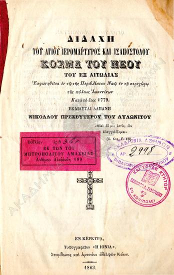 Διδαχή του αγίου ενδόξου ιερομάρτυρος και Ισαποστόλου Κοσμά του Νέου του εξ Αιτωλίας : εκφωνηθείσα εν τω της Περιβλέπτου Ναώ εν τη περιχώρω της πόλεως των Ιωαννίνων κατά το έτος 1779