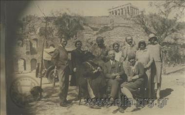 Καλλιτεχνική συντροφιά μπροστά στο θέατρο του Ηρώδου Αττικού. Σπύρος Βανδώρος, Ν. Κυπαρίσσης, Ναυσικά Κωστή Παλαμά, Αλεξ. Θ. Φιλαδελφεύς, Ασπασία Α. Χαλκοκονδύλη, Ιπποκράτης Σ. Καραβίας πρόεδρος Παρνασσού.