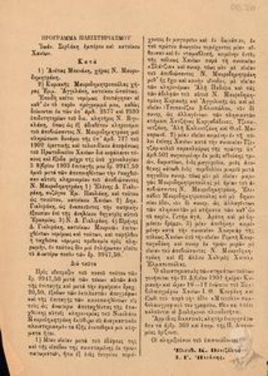 Πρόγραμμα πλειστηριασμού Ιωάννη Σερβάκη κατά Αννέτας Μπενάκη χήρας Ν. Μαυροδημητράκη και Κυριακής Μαυροδημητροπούλας χήρας Εμμ. Αγγελάκη, που αφορά τον αναγκαστικό πλειστηριασμό των ενυπόθηκωνν κτημάτων του Νικόλαου Μαυροδημητράκη.
