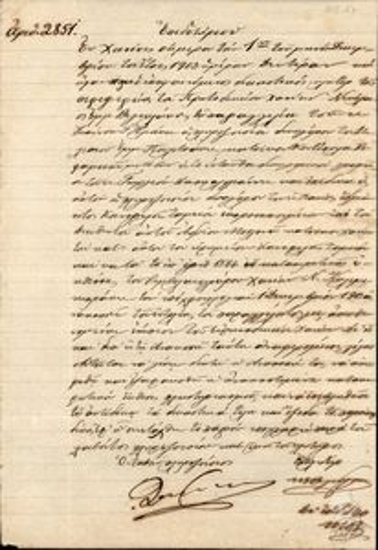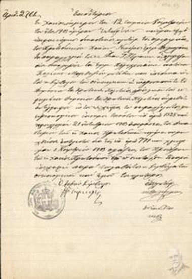 Επιδοτήριο αριθ. 2761 κατά παραγγελία του Ιωάν. Ηλιάκη ως πληρεξούσιου δικηγόρου του Εμμ. Πολυχρονάκη κατοίκου Καλέσης Μαλεβιζίου στον σύμβουλο επί των Οικονομικών ως εκπροσώπου του Δημοσίου της Κρητικής Πολιτείας ακριβές αντίγραφο της με χρονολογία 21 Οκτωβρίου 1903 απόφασης του Πρωτοδικείου Χανίων.