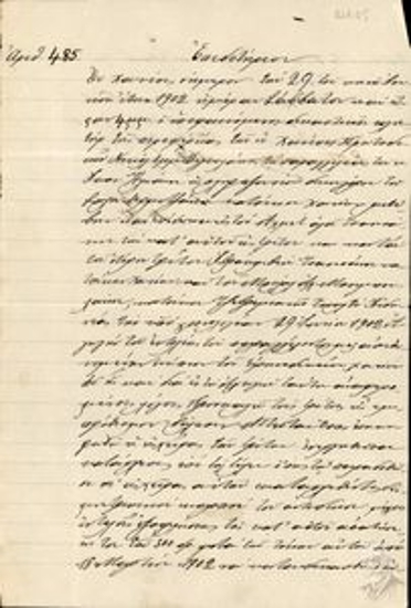 Επιδοτήριο αριθ. 485 κατά παραγγελία του Ιωάννη Γ. Ηλιάκη πληρεξούσιου δικηγόρου του Σαλή Δερμιτζάκη στον Αχμέτ αγά Τσαουσάκη ως τρίτου της υπό χρονολογία 29 Ιουνίου 1902 αγωγής κατ' αυτού ως τρίτου και κατά του έτερου τρίτου Ιβραήμ βέη Τσαουσάκη και κατά του Μπιλάλ Αχ. Μπουμπουλάκη, που αφορά οικονομική υπόθεση.