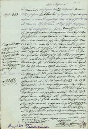 Επιδοτήριο αριθ. 463 κατά παραγγελία του Ιωάννη Γ. Ηλιάκη πληρεξούσιου δικηγόρου του Σαλή Δερμιτζάκη στον Ιβραήμ βέη Τσαουσάκη ως τρίτου του υπό χρονολογία 22 Ιουνίου 1902 κατασχετηρίου και κατά των λοιπών Αχμέτ αγά Τσαουσάκη ως τρίτου και κατά του Μπιλάλ Αχ. Μπουμπουλάκη, που αφορά οικονομική υπόθεση.