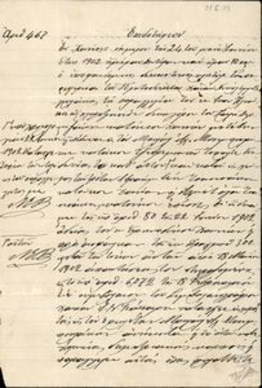 Επιδοτήριο αριθ. 467 κατά παραγγελία του Ιωάννη Γ. Ηλιάκη πληρεξούσιου δικηγόρου του Σαλή Δερμιτζάκη στον Μπιλάλ Αχ. Τσαουσάκη το, κατ' αυτού και κατά εις χείρας των τρίτων Ιβραήμ βέη Τσαουσάκη και Αχμέτ αγά Τσαουσάκη, με χρονολογία 22 Ιουνίου 1902 κατασχετήριο, που αφορά οικονομική υπόθεση.