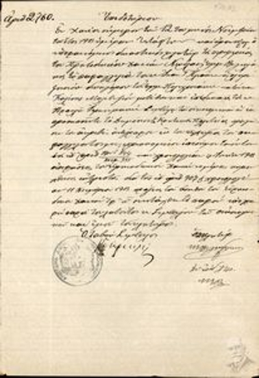 Επιδοτήριο αριθ. 2760 κατά παραγγελία του Ιωάν. Ηλιάκη ως πληρεξούσιου δικηγόρου του Εμμ. Πολυχρονάκη κατοίκου Καλέσης Μαλεβιζίου στον Ηρακλρή Ιερωνυμάκη σύμβουλο επί των Οικονομικών ως εκπροσώπου του Δημοσίου της Κρητικής Πολιτείας ακριβές αντίγραφο της με χρονολογία 4 Ιουνίου 1903 απόφασης του Ειρηνοδικείου Χανίων.