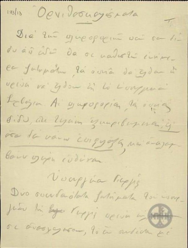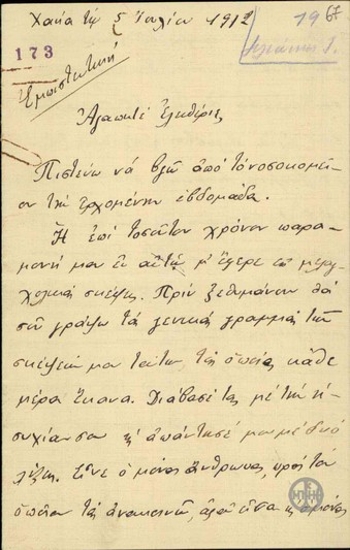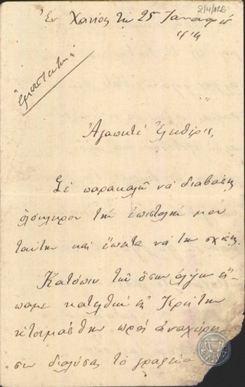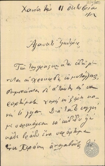 Επιστολή του Ι.Γ.Ηλιάκη προς τον Ε.Βενιζέλο.