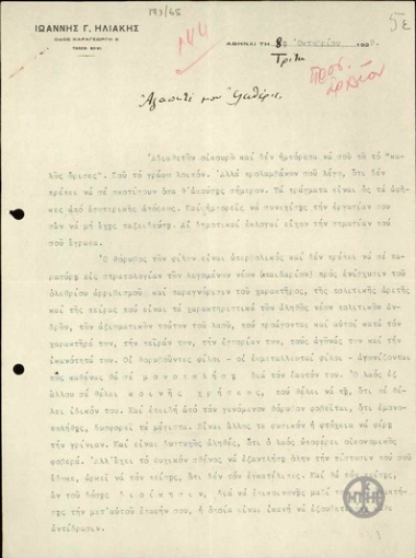 Επιστολή του Ι.Ηλιάκη προς τον Ε.Βενιζέλο, με την οποία εκφράζει την ανακούφιση του για δημοσίευμα στην εφημερίδα "Ελεύθερο Βήμα."