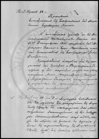 Πρακτικόν Συνεδριάσεως της Ολομελείας του Δημοτικού Συμβουλίου Χανίων