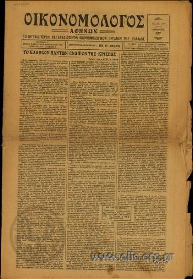 Επιστολή του Μιχ.Χρ.Αιλιανού προς τον Ε.Βενιζέλο σχετικά με την οικονομική κρίση στην Αμερική.