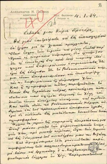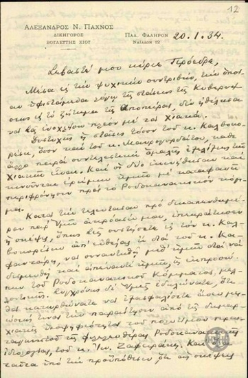 Επιστολή του βουλευτή Χίου Αλ.Παχνού προς τον Ε.Βενιζέλο σχετικά με την διασπαστική πολιτική για το Ροδοκανακικό κόμμα των Καλβοκορέση και Μαυροκορδάτου στο ζήτημα της ανάδειξης κοινού υποψηφίου δημάρχου Χίου, ενώ προτείνει την λύση Ζαφειράκη για το δημαρχιακό θώκο ως προσωπικότητα που τυγχάνει της αποδοχής τόσο του Ροδοκανακικού κόμματος όσο και του Λαϊκού.