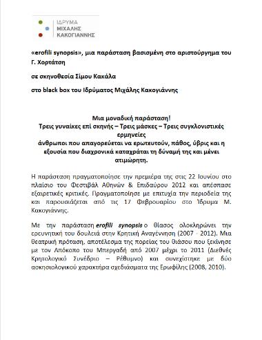 Ελληνικός Οργανισμός Τουρισμού: Υπηρεσία Τουριστικών Εκδηλώσεων, Αμφι-Θέατρο Σπύρου Α. Ευαγγελάτου Αθήνα, Δη.Πε.Θέ. Κρήτης Κρήτη