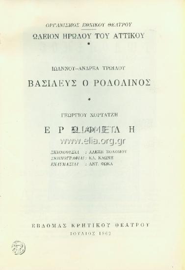 Ερωφίλη : Tραγωδία / Γεωργίου Χορτάτζη (1600), εκδιδομένη εκ των αρίστων πηγών μετ'εισαγωγής και λεξιλογίου υπό Στεφ. Ξανθουδίδου.