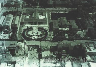 Τα Προπύλαια του Πανεπιστημίου, η Ακαδημία και η Βιβλιοθήκη σε λήψη από το αεροπλάνο της εφημερίδας ΑΚΡΟΠΟΛΗ.