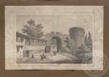 "Porte triomphale de l'ancienne Citadelle a Andrinople", χαρακτικό άποψης της πύλης εισόδου στην Αδριανούπολη, 1840