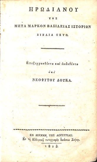 Ηρωδιανού της μετά Μάρκον βασιλείας ιστοριών βιβλία οκτώ. / Ήδη τρίτον τύποις εκδοθέντα, και επιμελώς διορθωθέντα παρά Σπυρίδωνος Βλαντή. Οις τέτακται και επικτήτου φιλοσόφου το Εγχειρίδιον.