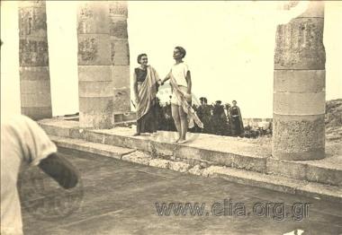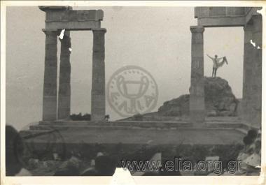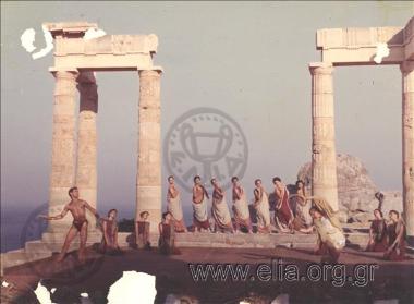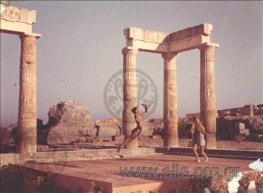 Ρόδος. Επισκέπτες στον εν μέρει αναστηλωμένο δωρικό ναό της Λινδίας Αθηνάς, στο ομώνυμο ιερό στην ακρόπολη της Λίνδου.