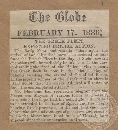 "The Greek fleet. Expected British action", "The Globe", 17/2/1886