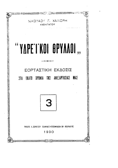 "Υδρέϊκοι Θρύλλοι" : Εορταστική έκδοσις στα εκατό χρόνια της ανεξαρτησίας μας / Νικολάου Γ. Χαλιόρη.