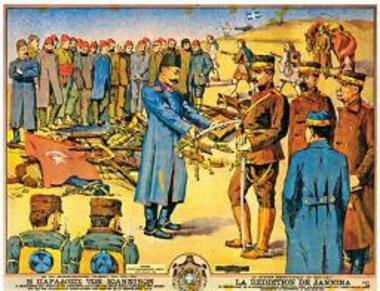 "Η ΠΑΡΑΔΟΣΙΣ ΤΩΝ ΙΩΑΝΝΙΝΩΝ/ Ο ΑΦΟΠΛΙΣΜΟΣ ΤΗΣ ΦΡΟΥΡΑΣ ΤΟΥ ΜΠΙΖΑΝΙΟΥ ΚΑΙ Η ΥΠΟ ΤΟΥ ΕΣΣΑΤ ΠΑΣΣΑ ΠΑΡΑΔΟΣΙΣ ΤΟΥ ΞΙΦΟΥΣ ΤΟΥ ΕΙΣ ΤΟΝ ΣΤΡΑΤΗΛΑΤΗΝ ΚΩΝΣΤΑΝΤΙΝΟΝ ΤΟΝ ΝΙΚΗΤΗΝ ΤΗ 21 ΦΑΒΡΟΥΑΡΙΟΥ 1913 LA REDDITION DE JANNINA / LE DESARMEMENT DE LA GARNISON DE BISANI, ESSAT-PACHA REND SON EPEE AU CHEF DE L' ARMEE HELLENIQUE CONSTANTIN LE VICTORIEUX LE 21/16 MARS 1913"