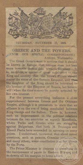 "Greece and the Powers", εφημερίδα "The Western Morning News", 22/11/1888