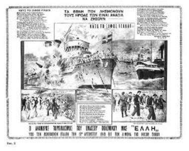 "Ο ΑΝΑΔΡΟΣ ΤΟΡΠΙΛΛΙΣΜΟΣ ΤΟΥ ΕΝΔΟΞΟΥ ΠΟΛΕΜΙΚΟΥ ΜΑΣ ΕΛΛΗ ΥΠΟ ΤΩΝ ΔΟΛΟΦΟΝΩΝ ΙΤΑΛΩΝ ΤΗΝ 15ην ΑΥΓΟΥΣΤΟΥ 1940 ΕΙΣ ΤΟΝ ΛΙΜΕΝΑ ΤΗΣ ΝΗΣΟΥ ΤΗΝΟΥ"