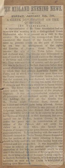 "The Greek diplomat on the question", "The Midland Eveneing News", 25/1/1886