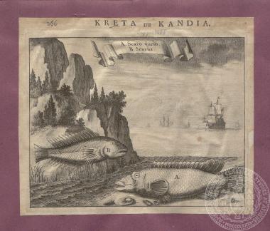 "Kreta nu Kandia, A. scaro vario, B. Scarus"Εικόνα του Olfert Dapper από σελίδα βιβλίου, με αναπαράσταση ψαριών (σκάρων). 1688