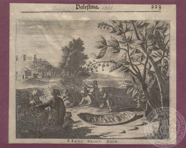 "S. Ians Broot Boom" Εικόνα από σελίδα βιβλίου με αναπαράσταση τοπίου, δέντρων και χαρουπιών, από τον Olfert Dapper. 1681