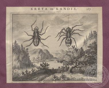 "Kreta nu Kandia. De Spinneweb Tarantula". Εικόνα του Olfert Dapper από σελίδα βιβλίου, με αναπαράσταση αραχνών (tarantula)1688