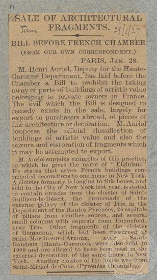 "Sale of Architectural fragments" άρθρο στην εφημερίδα "The Times", 29/01/1927.
