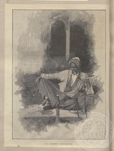 "Cairene Shopkeeper" Καταστηματάρχης στο Κάιρο, χαλαρώνει σε καθιστή στάση καπνίζοντας. Λιθογραφία.
