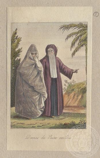 "Dames du Caire voilées". Γυναίκες περπατούν στην ύπαιθρο του Καΐρου, Λιθογραφία.